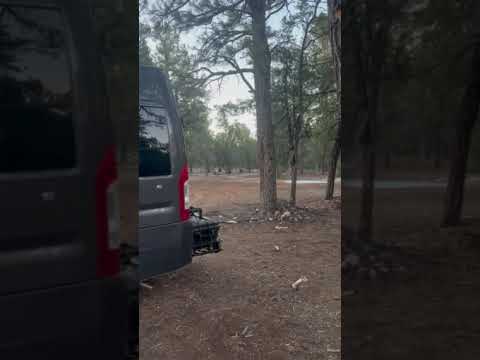Large, open dispersed campsite set among tall ponderosa pines with excellent spacing and privacy. Ground is mostly flat, hard-packed dirt with pine needles—easy for vans, trucks, and small RVs. Multiple pull-in options make maneuvering simple, even at dusk.