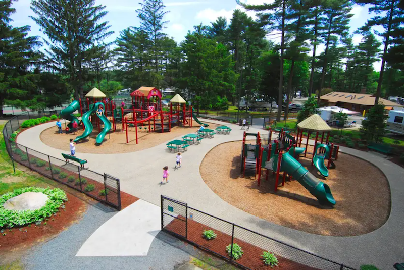 What makes it great: Normandy Farms is not your average campground. Halfway between Boston and Cape Cod, it is a luxury camping destination that has been a family tradition since 1971. Whether your family arrives in an RV or opts for one of the resort’s glamping rentals, 100 wooded acres sets the stage for an unforgettable getaway. When it comes to keeping kids busy and happy, Normandy Farms delivers in a big way. The themed playground features two areas designed for different age groups, and younger guests can splash around at a farm-themed splash pad. The resort boasts four pools in total, including an indoor heated pool, two outdoor Olympic-size pools, and a heated outdoor pool near the Reception Center.